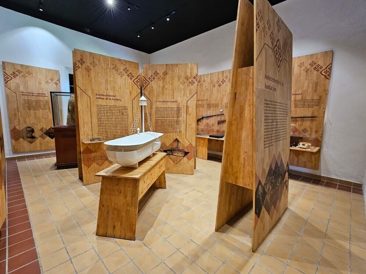 El recorrido está dividido en seis salas temáticas que siguen una línea de tiempo: los orígenes de Payo Obispo, su fundación, la llamada “ciudad de madera”, la influencia nacionalista de mediados del siglo XX, la reconstrucción tras el huracán Janet y la vida cotidiana actual. Cada sala tiene fotos, documentos y piezas auténticas que la gente donó. Entre lo más llamativo está la ropa del fundador, Othón P. Blanco, y la réplica a escala del “pontón de Chetumal”, un barco aduana que controlaba el comercio con Belice.