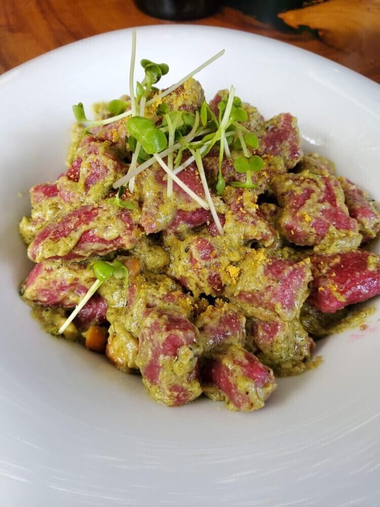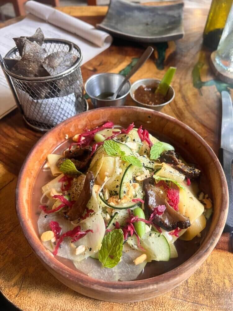 Restaurante Agni Vital Kitchen Bacalar trabaja una propuesta basada en plantas, con combinaciones globales y producto local. La carta suele incluir preparaciones muy cuidadas; ojo a cinco platos que resumen bien el estilo: moussaka de berenjena, ñoquis de betabel y plátano al pesto, tacos de jamaica con tempeh, okonomiyaki y un ramen tom yum que reconforta sin sentirse pesado.