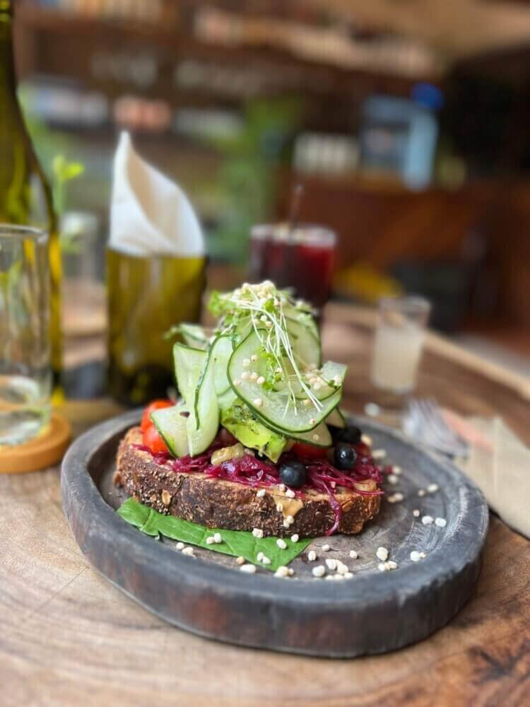 Rango $$ con porciones pensadas para compartir. Considera entrada, principal y bebida de la casa como kombucha o infusiones hechas al momento.