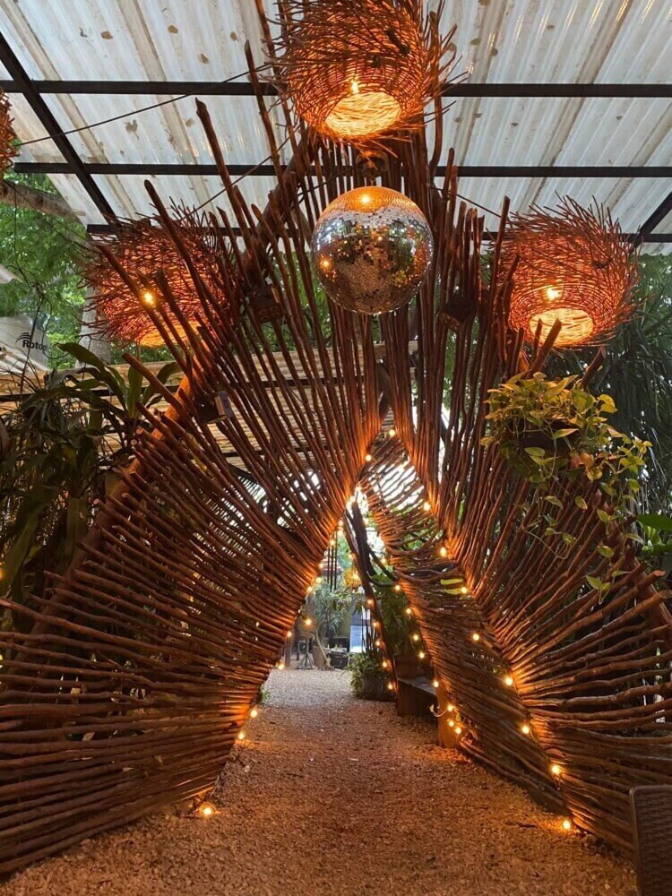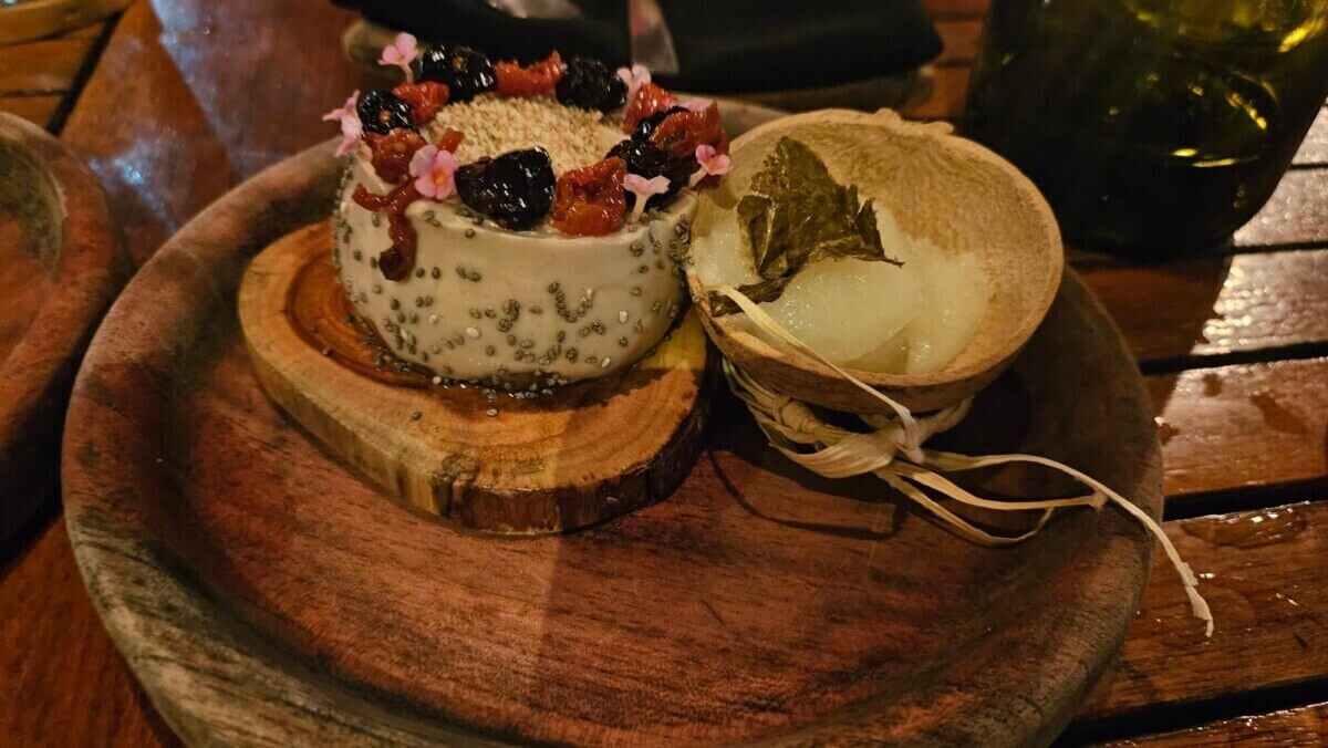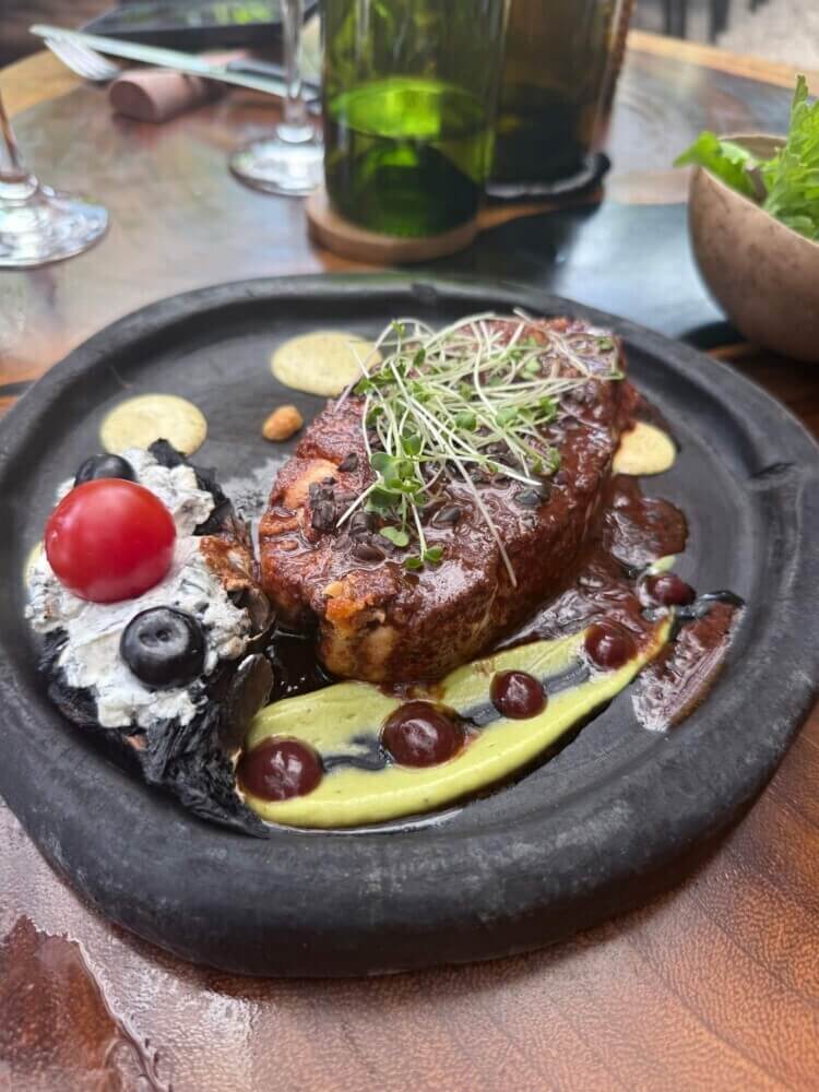 Nixtamal Bacalar cocina mexicana de autor con parrilla, humo y rescoldos. La propuesta se mueve entre mar y tierra: aguacate tatemado con quinoa, hongos rellenos de espuma de aguacate, atún sellado con mantequilla tropical, salmón con costra de cacao y un tiramisú de huitlacoche que sale directo del fogón dulce. Son platos que suenan atrevidos, pero en el jardín tienen sentido.