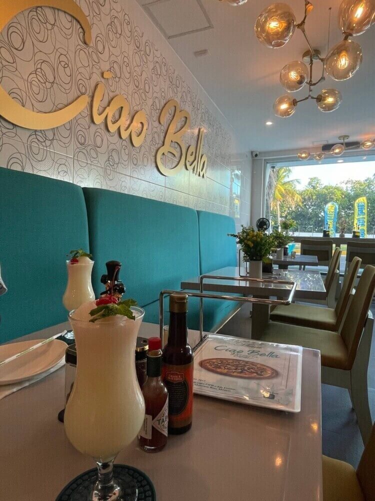Ciao Bella PizzerĂa Chetumal ofrece consumo en salĂłn, pizzas para compartir y una barra con coctelerĂa, cervezas y refrescos, ademĂĄs de cafĂ© y bebidas sin alcohol.